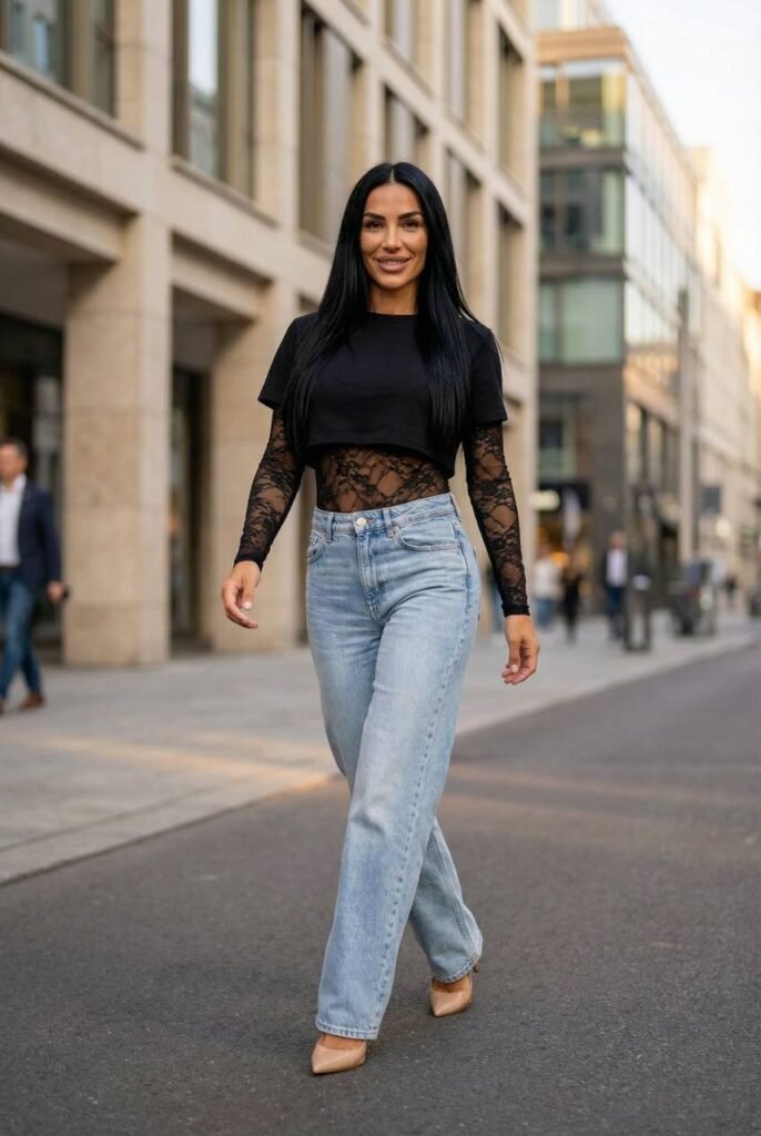Combining a lace top with classic denim creates the perfect balance between casual and elegant. The fitted top adds a feminine touch, while the relaxed jeans keep the outfit comfortable and easy to wear.