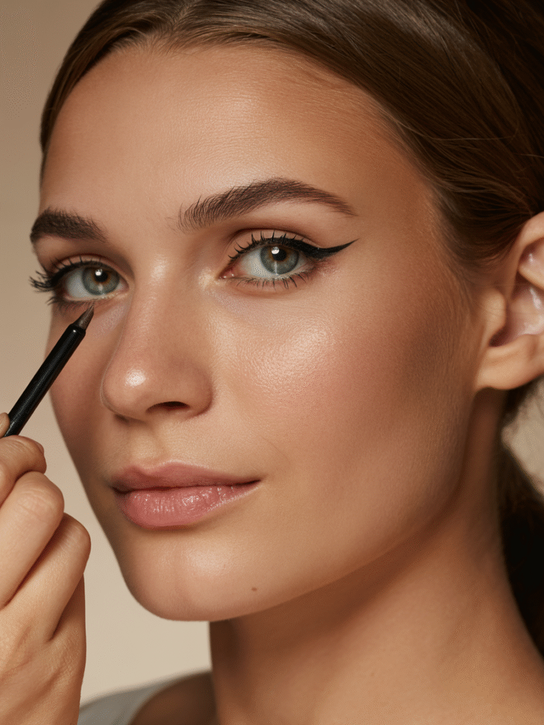 A soft flick of eyeliner elevates any look instantly. Pair with peach blush and a subtle nude gloss for a Parisian-inspired vibe.