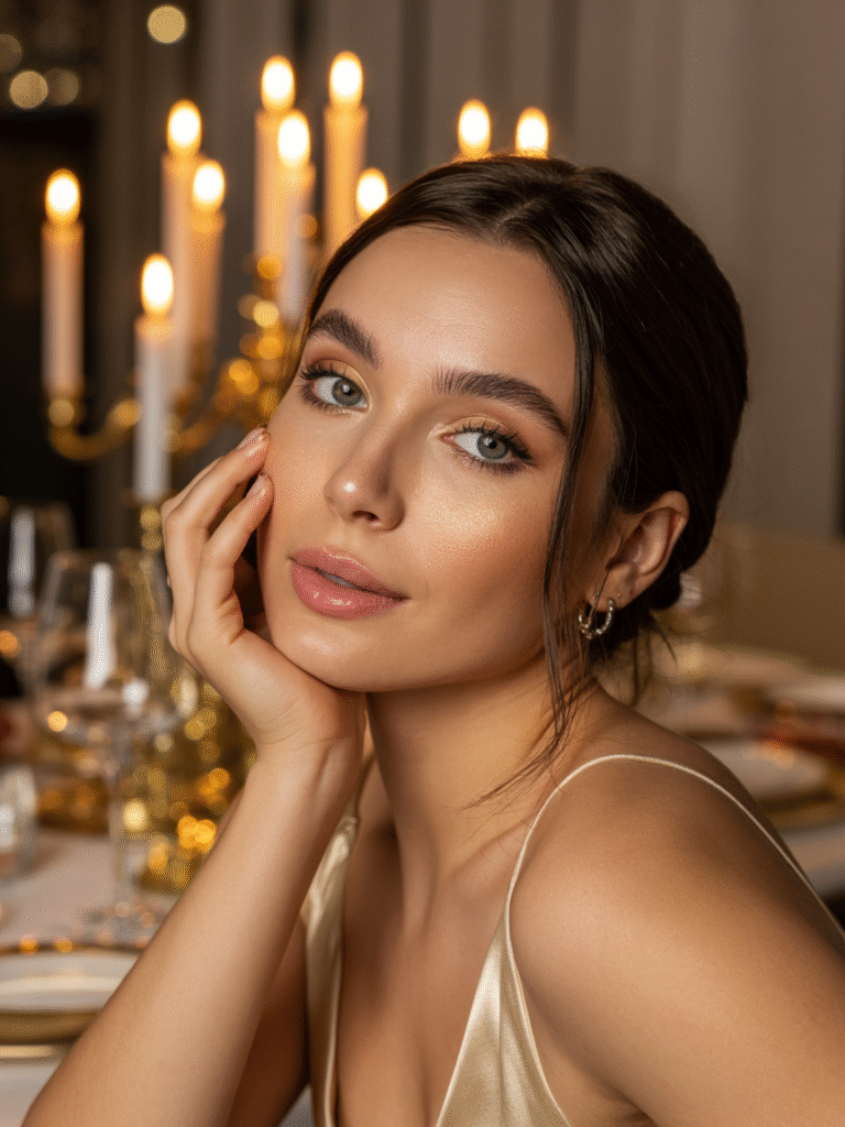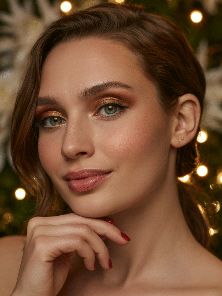 Soft champagne tones on the lids and cheekbones create an effortless “lit-from-within” glow. Perfect for cozy holiday dinners.