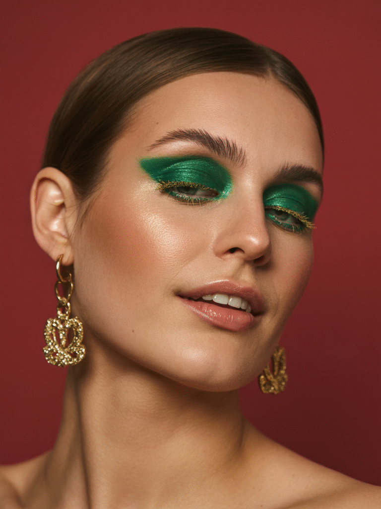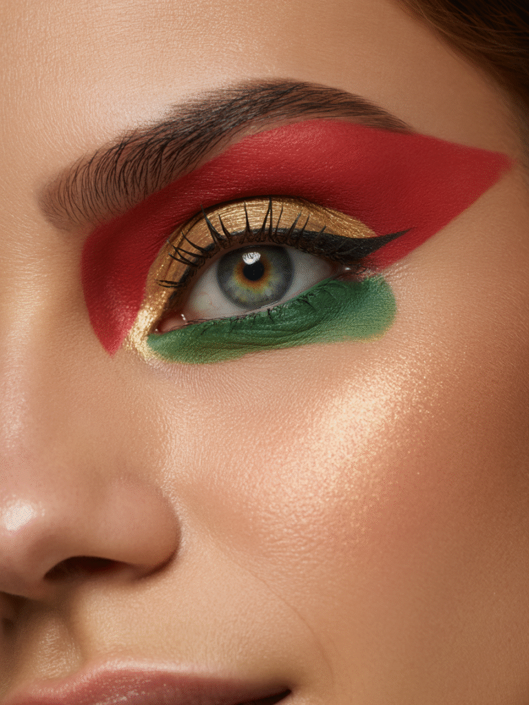Mix rich jewel tones like red, green, and gold on your eyes for a bold, artistic finish. Ideal for New Year’s Eve!