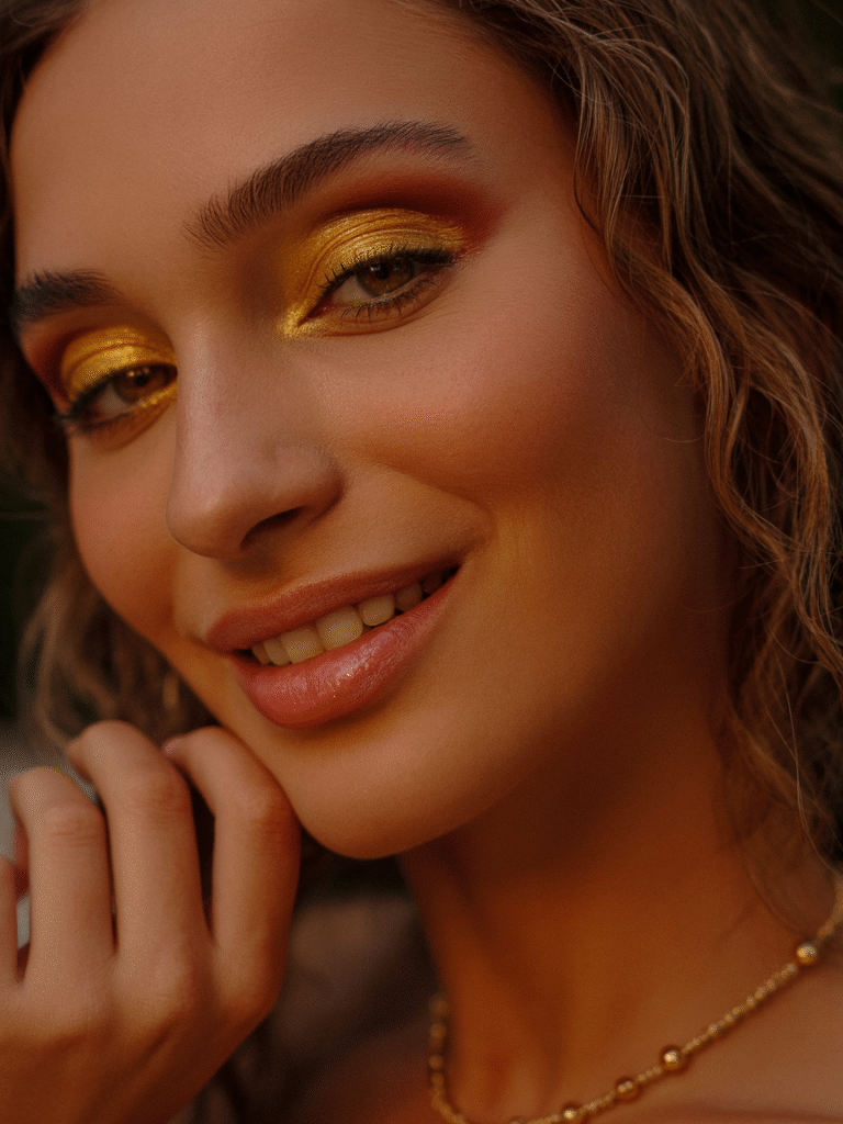 Gold never goes out of style! Apply metallic gold eyeshadow, soft bronzer, and a nude lip for a radiant glow.