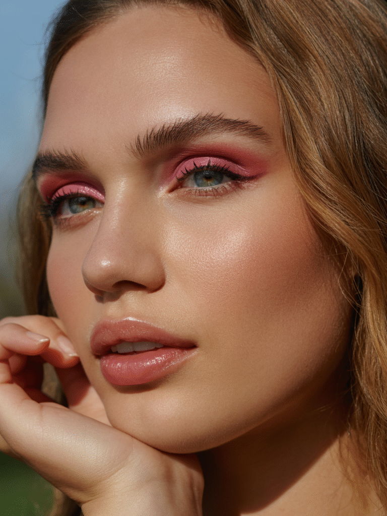 Romantic and glowing, this look combines rosy blush, pink shimmer eyeshadow, and glossy lips — ideal for daytime festivities.