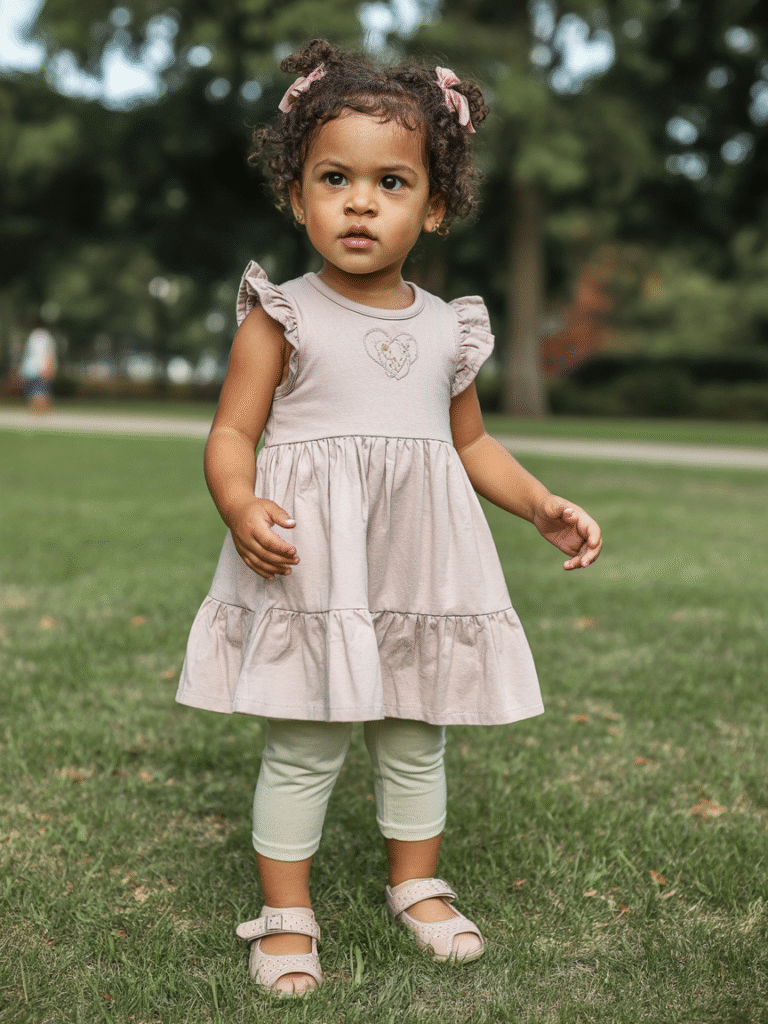 Perfect for girls who love to twirl! A soft cotton dress paired with leggings offers comfort and freedom to move. Add a cardigan for cooler days.