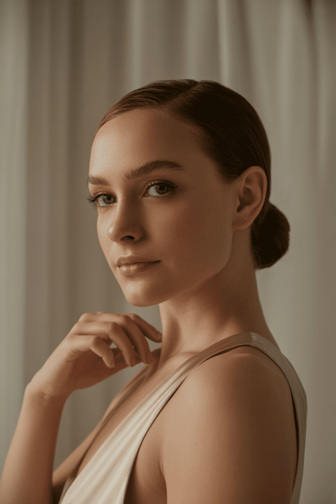 A smooth, polished bun resting at the nape of the neck, embodying discipline and quiet elegance.