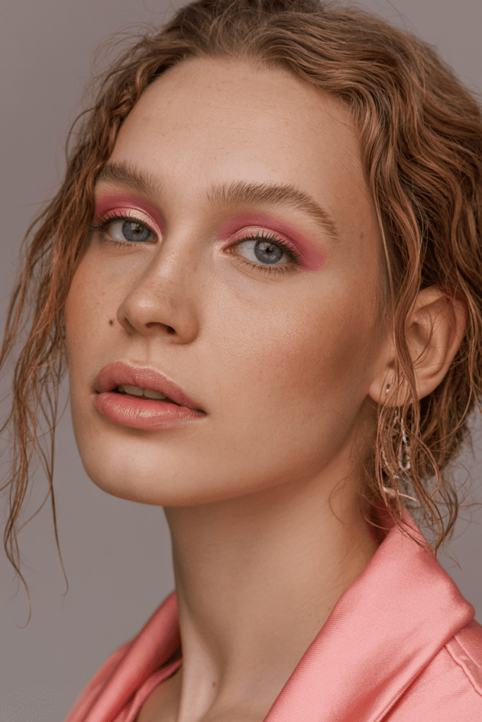 Gentle pink tones across cheeks and lips.