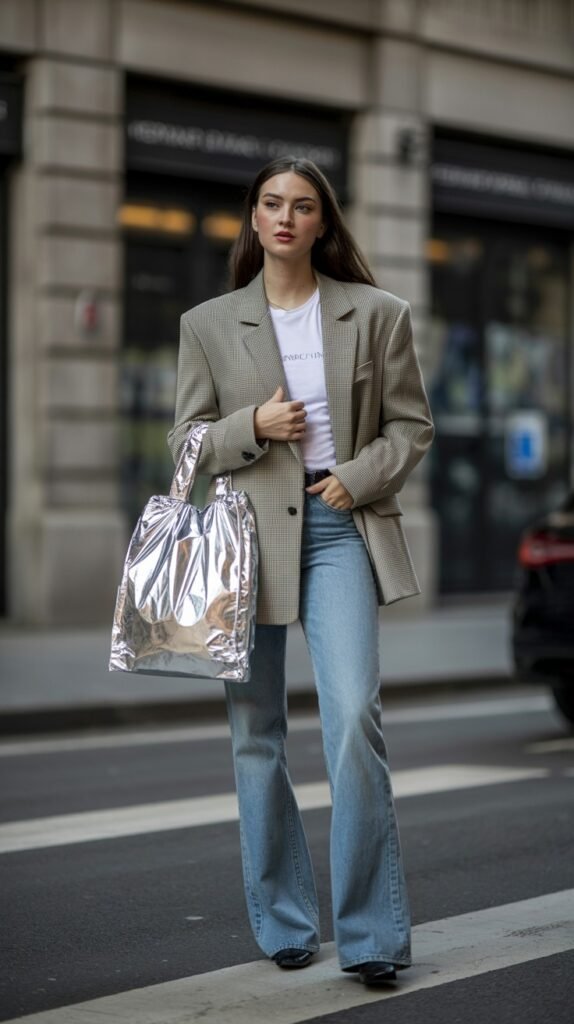 10. Tin foil metallic bag + fitted blazer over a tee and flare jeans