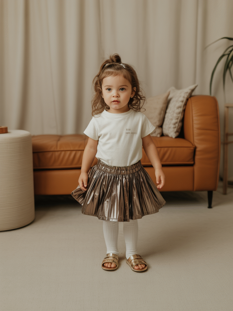 Mixing metallic tones creates instant party glam! Combine a silver skirt with a gold top (or vice versa), and add matching sneakers or glitter boots. It’s bold, fun, and picture-perfect.