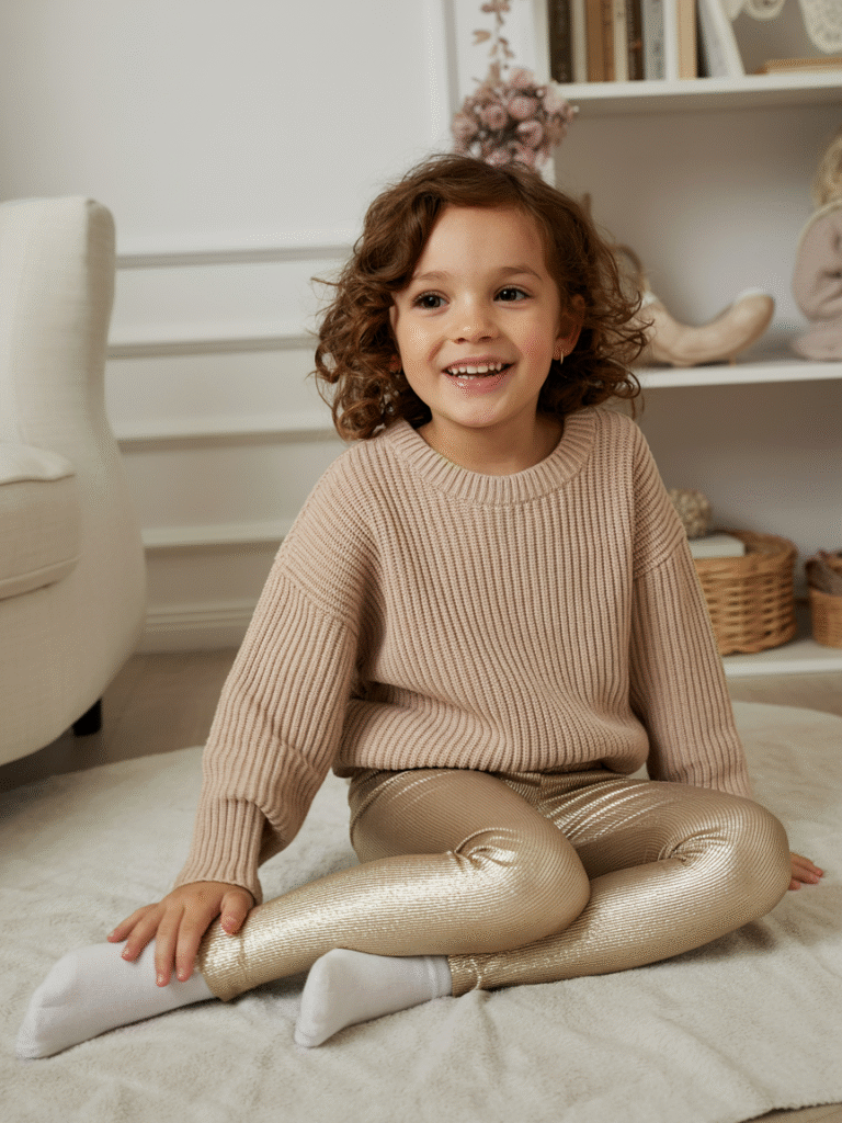 Perfect for younger kids or casual celebrations! A soft knit sweater paired with metallic leggings strikes the perfect balance between comfort and sparkle. Add boots and a sequined beanie for the win.