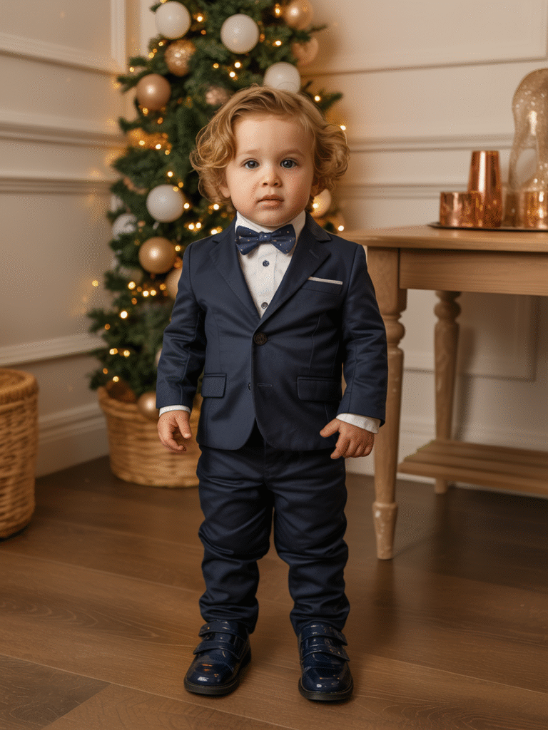 For little gentlemen, a classic suit never fails. Opt for navy or charcoal gray with a crisp white shirt and bow tie. Shiny loafers or mini dress shoes complete the smart look — ideal for family dinners or formal parties.